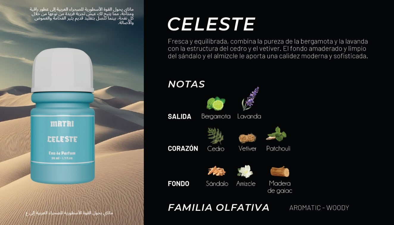 Celeste es ideal para esos momentos en que buscas tranquilidad sin perder presencia: sofisticado, versátil, perfecto para la noche o para un día donde quieres sentirte bien contigo mismo. Un aroma que abraza y reconecta.