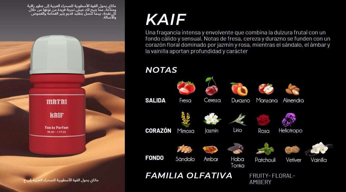 Kaif es la dulzura lujosa hecha perfume. Una explosión jugosa de cereza y frutas rojas se mezcla con flores aterciopeladas y una base cálida de vainilla, ámbar y sándalo. Sofisticado, adictivo y envolvente, perfecto para dejar huella en cada paso.